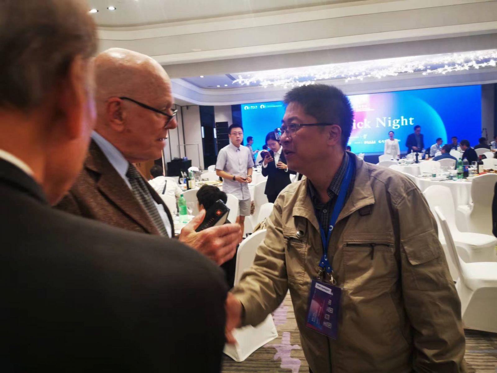 Click Night 晚宴上Barry Sharpless和蔡凡平討論我們工廠生產(chǎn)的代號(hào)為“鹽”的一個(gè)點(diǎn)擊化學(xué)關(guān)鍵物料的process chemistry,給予高度評(píng)價(jià) 。